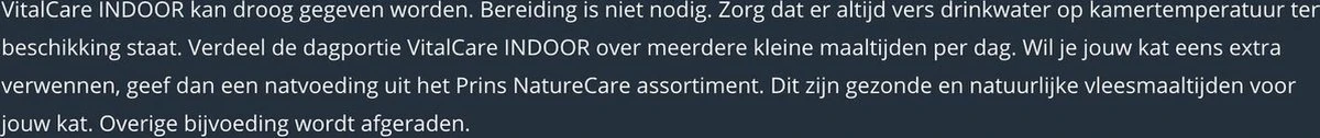 VitalCare Indoor is een hoogwaardige voeding speciaal voor katten die in huis leven. Binnenkatten zijn vaak wat minder actief en hebben daarom een lagere voedingsbehoefte. Het hoge eiwitgehalte zorgt dat de spieren intact blijven en het lagere vetgehalte helpt uw kat op gewicht te blijven.Hierdoor is de VitalCare Indoor ook bijzonder geschikt voor gesteriliseerde of gecastreerde katten. Door toevoeging van natuurlijke vezels vormen haren die worden ingeslikt tijdens het wassen geen haarballen in de maag. De vezels zorgen voor een natuurlijke afvoer via het maag-darmkanaal van de kat. Hierdoor verlaten de haren het lichaam met de ontlasting en geven ze geen problemen meer.Veel binnenkatten hebben last van gebitsproblemen. De vorm van het brokje is zo ontworpen dat de kat beter moet kauwen. Dit helpt tandsteen en tandplak voorkomen. Urineverzurende stoffen helpen blaasgruis te voorkomen.