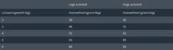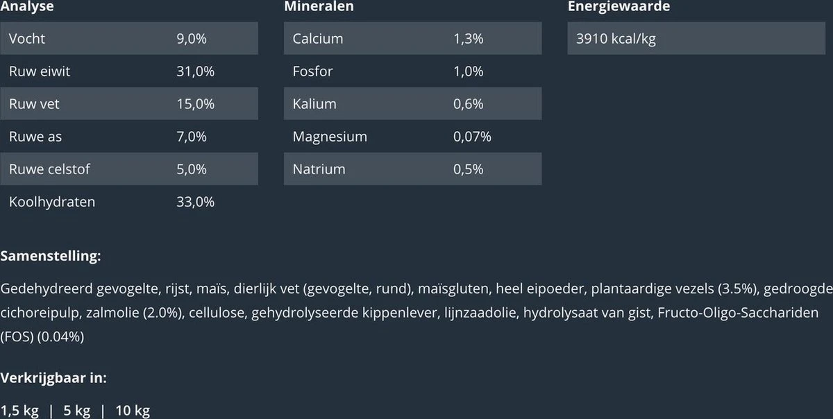 | Toevoegingsmiddelen | Calcium 1.3%Fosfor 1.0% Kalium 0.6% Magnesium 0.07% Natrium 0.5% |
