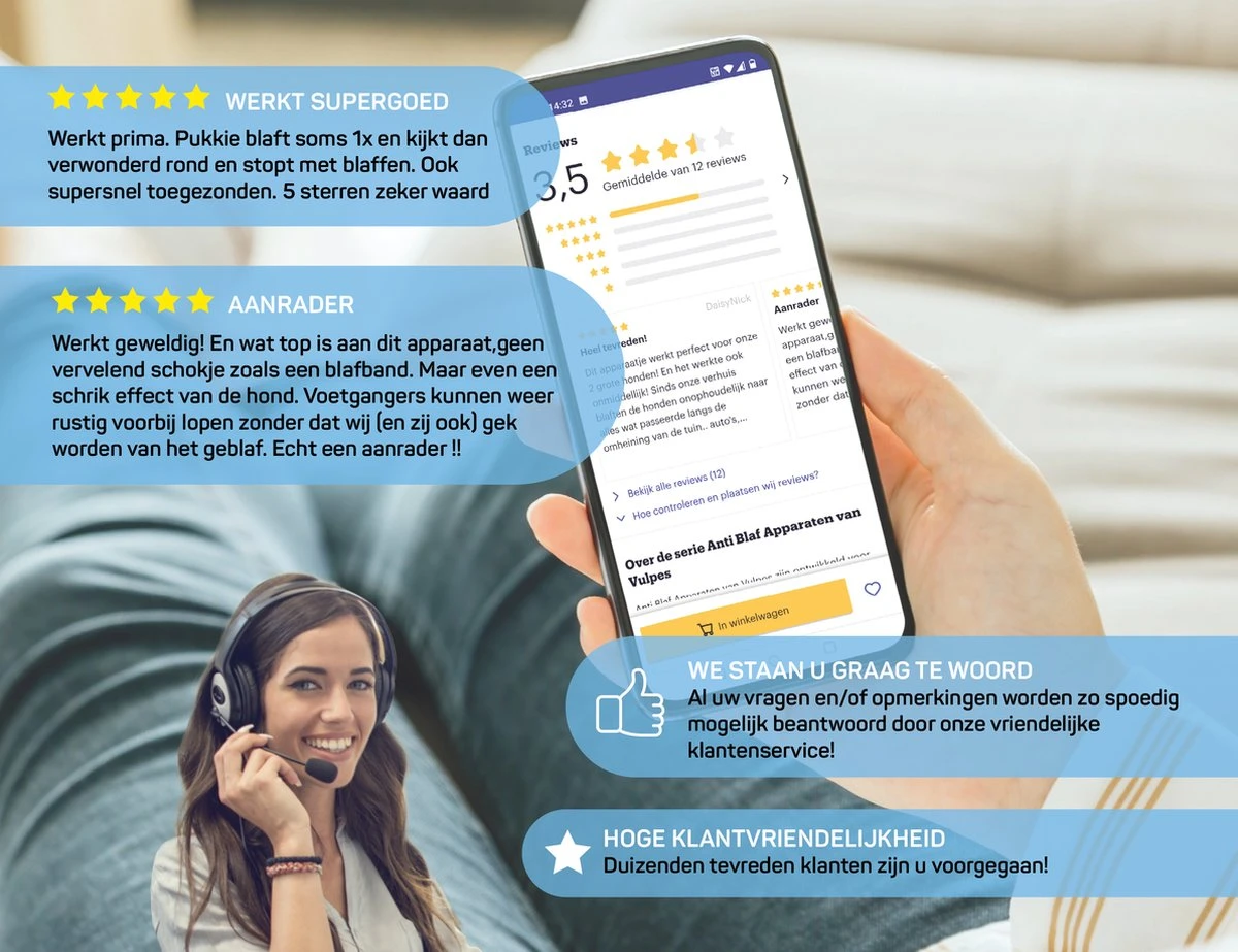 Het Anti blaf apparaat van Vulpes Pets® is zeer diervriendelijk en geeft geen pijnlijke schokken of andere pijnlijke signalen af. Zo leer je je trouwe viervoeter dus op een vredige manier het blaffen af.