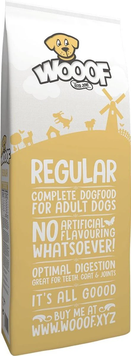 WOOOF regular 18KG is geschikt voor zowel grote als kleine honden met een gemiddeld energieverbruik. Het begint allemaal met natuurlijke ingrediënten. Natuurlijk. Je wilt precies weten wat je hond eet. Echte en herkenbare ingrediënten die je kent en vertrouwt. Ook kijk je naar vitaminen en mineralen.